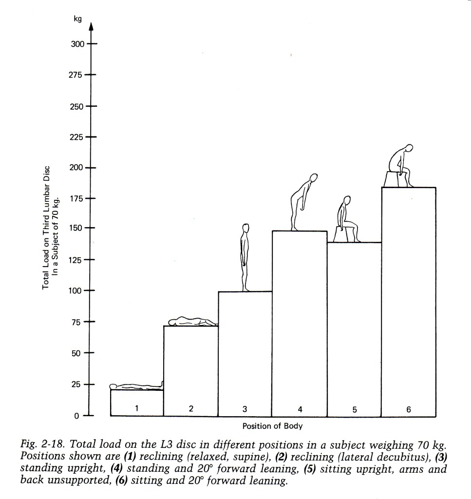 Bad news, unfortunately, sitting is already quite a ‘straining‘ activity for our backs. In your back you have vertebrae (the bones), and discs (the softer bits in between the vertebraes that allow movement in our back and they also work as shock absorbers). Discs change shape to accommodate movement in the spine. The diagram below shows what positions put the most load on your L3 disc (the vertebrae in the middle of your lumbar spine):